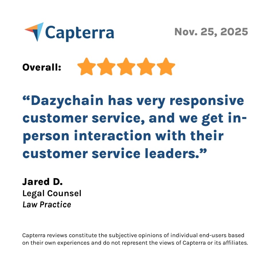 “Perhaps the most valuable advantage of Dazychain is it alleviates Sunday afternoons in the office manually preparing task lists for the week and reports for Monday morning executive meetings.”