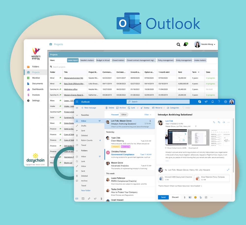Dazychain matter management software for in-house legal teams has built-in Microsoft Outlook integration for seamless email organization, storage and management.