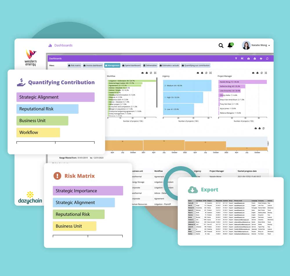 Dazychain enables you to demonstrate your strategic contribution because you can create and share reports that display data such as matter status, risk, strategic alignment, and matters by manager, region, internal client and business unit.